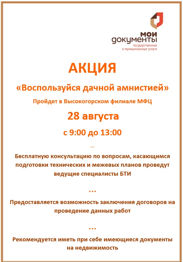 Федеральный закон от 2 августа 2019 г. № 267-ФЗ возобновил упрощенный порядок оформления жилых и садовых домов, возведенных на садовых участках. До 1 марта 2021 года для этой категории объектов недвижимости не требуется разрешительной документации и нет необходимости уведомлять органы местного самоуправления о начале строительства. Как быстро оформить дом и землю под ним? Что делать собственникам объектов, не попавших под дачную амнистию? На эти и множество других вопросов, которые возникают у татарстанцев в ходе бесплатных консультаций ответят ведущие специалисты АО «Бюро технической инвентаризации республики Татарстан». Удобно, что при необходимости, в ходе акции, не выходя из МФЦ, можно будет заказать межевание земельного участка, (если он еще не оформлен в собственность) или технический план дома. Необходимые документы рекомендуется иметь при себе. В Высокогорском филиале МФЦ день консультации пройдет 28 августа (среда) с 9:00 до 13:00.