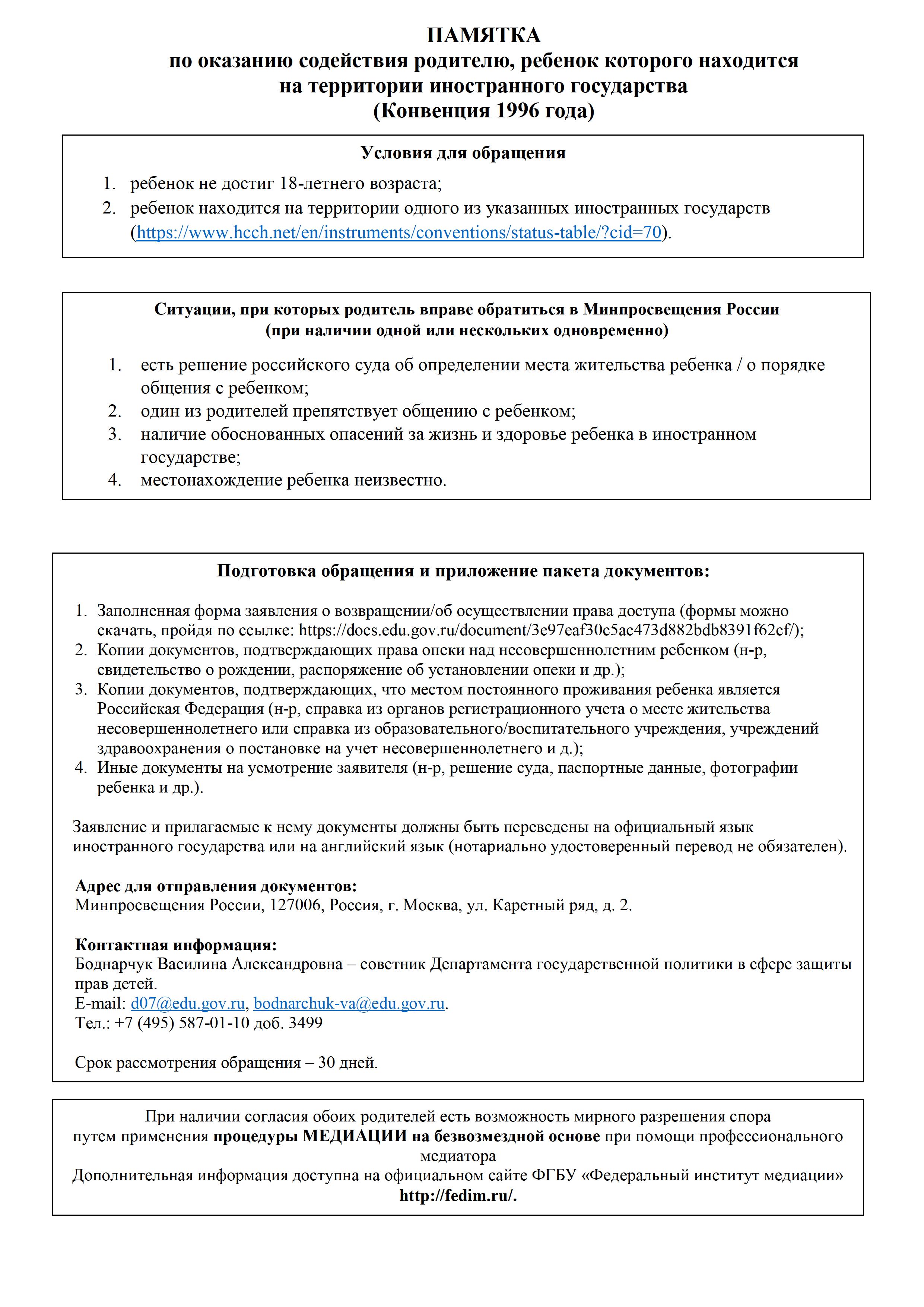 ПАМЯТКА по оказанию содействия родителю, ребенок которого находится на территории иностранного государства (Конвенция 1996 года)