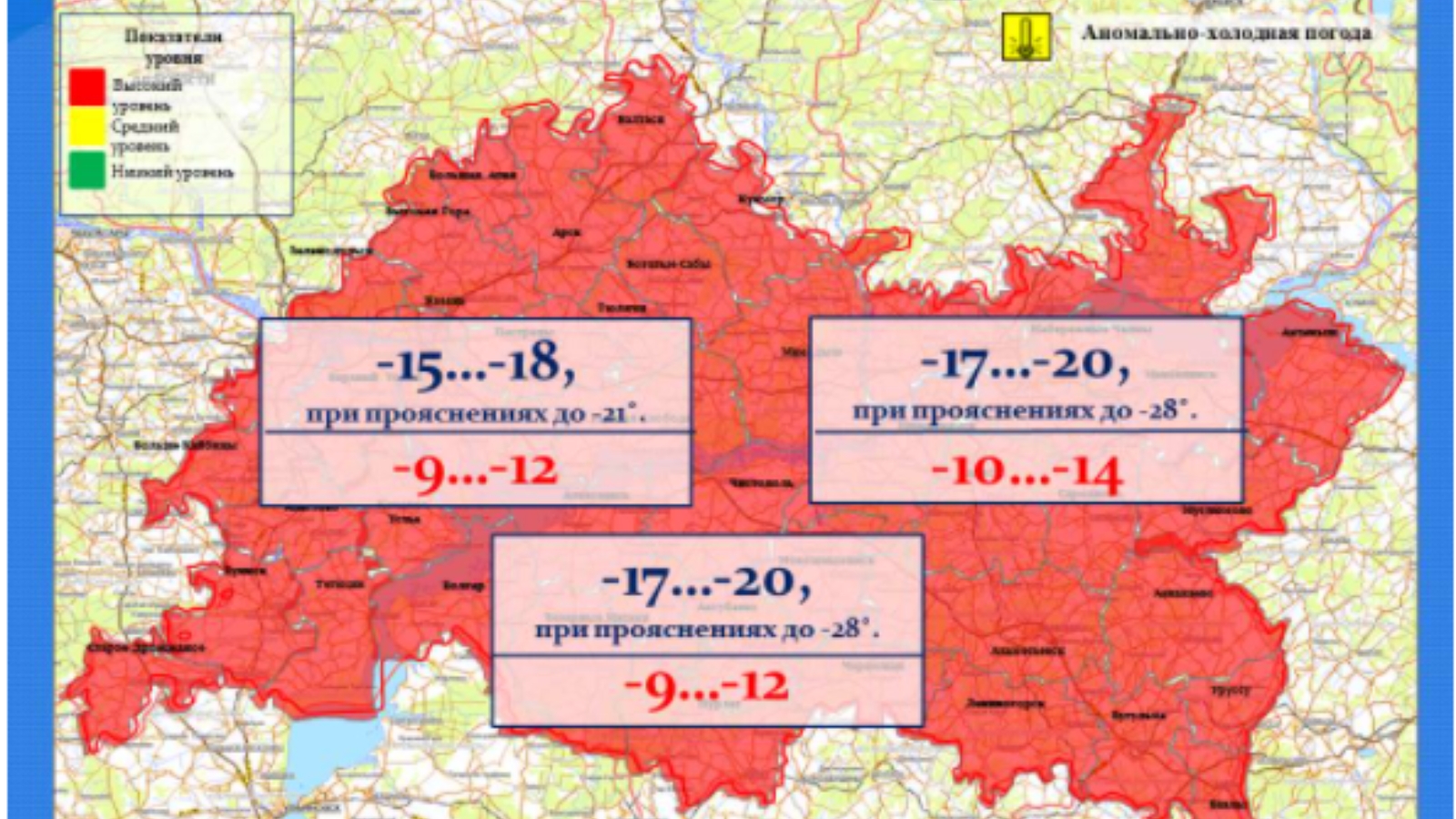 На территории Республики Татарстан установилась аномально-холодная погода со среднесуточными температурами воздуха на 9-16° ниже климатической нормы, с минимальными температурами до -20..-25°, в отдельных районах до -28°. Аномально-холодная погода сохранится в республике по 10 декабря 2020 года.