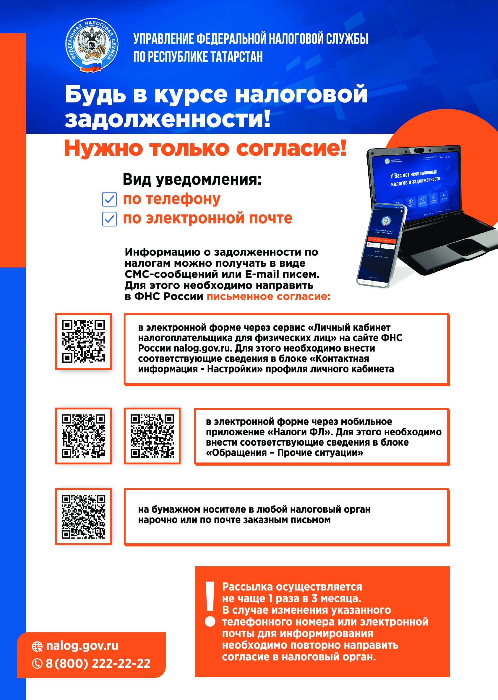 Дав свое согласие на информирование, налогоплательщик сможет получать информацию о задолженности по налогам в виде СМС-сообщений на телефон или E-mail писем на электронную почту. Рассылка осуществляется не чаще 1 раза в 3 месяца.