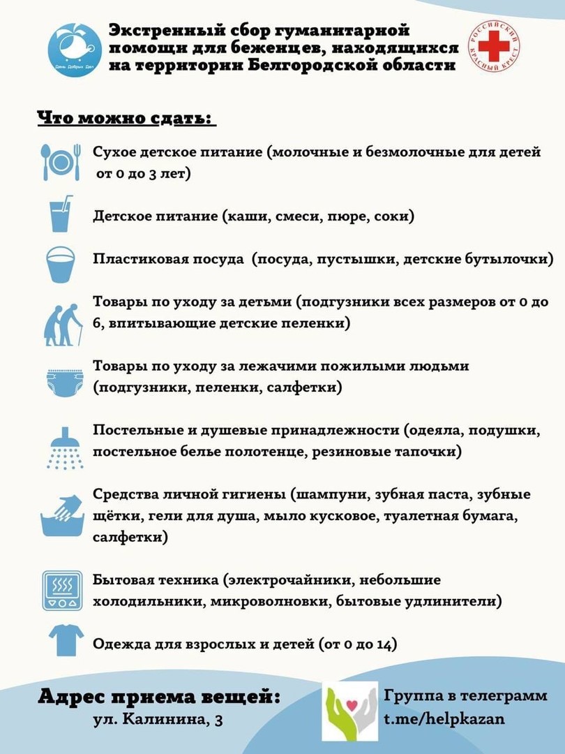 Благотворительный фонд «День добрых дел» совместно с Татарстанским отделением Красного Креста по обращению Центрального Аппарата Российского Красного Креста осуществляет сбор гуманитарной помощи для жителей приграничных территорий Донецкой Народной Республики, Луганской Народной Республики, Украины и Российской Федерации, вынужденно эвакуировавшихся на территорию г. Белгород и Белгородской области.