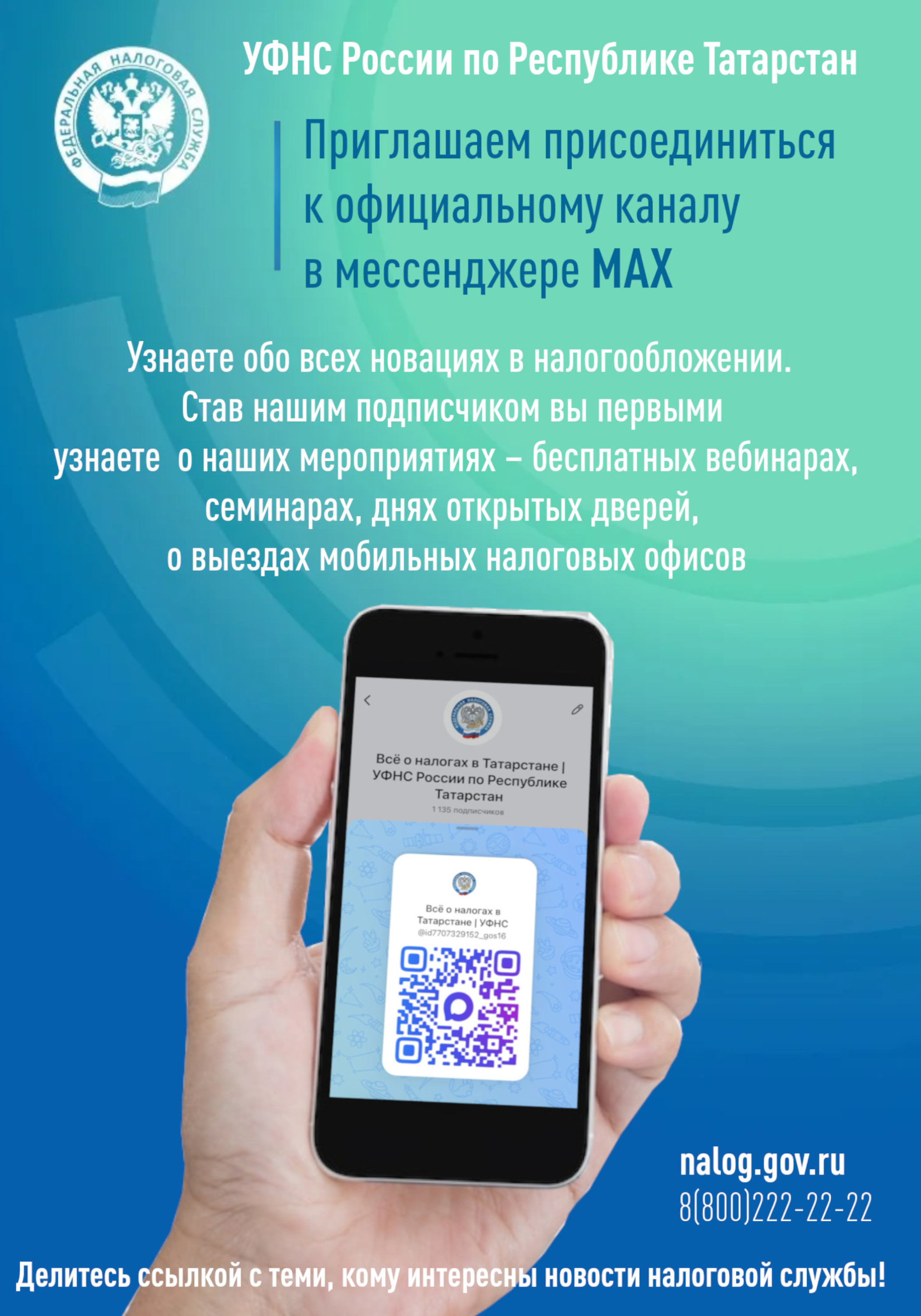 УФНС России по Республике Татарстан сообщает о запуске официального канала в национальном мессенджере MAX «Всё о налогах в Татарстане/ УФНС России по Республике Татарстан».