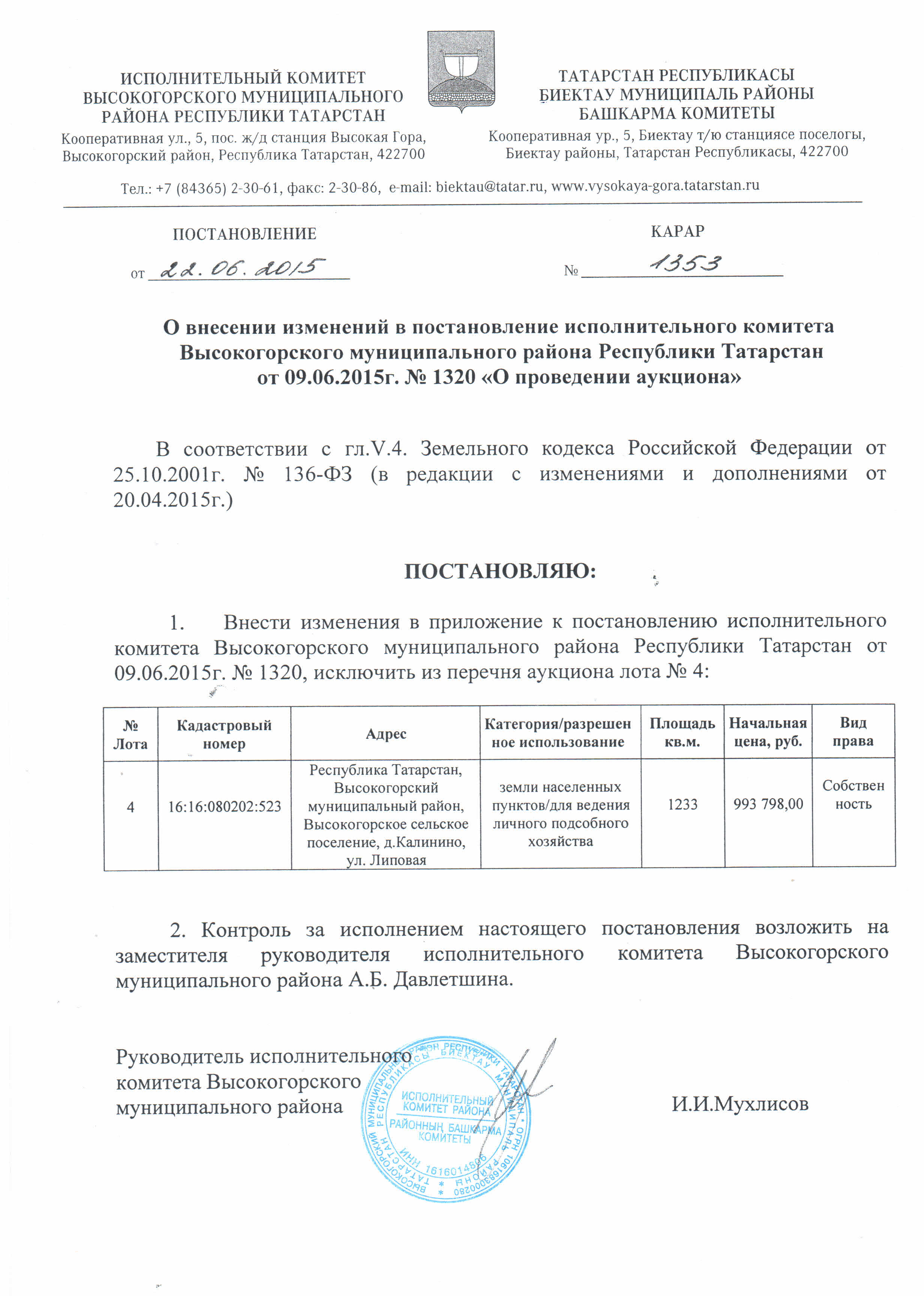 Постановление исполнительного комитета Высокогорского муниципального района Республики Татарстан от 22.06.2015 г. № 1353 "О внесении изменений в постановление исполнительного комитета Высокогорского муниципального района Республики Татарстан от 09.06.2015 г. № 1320 «О проведении аукциона»