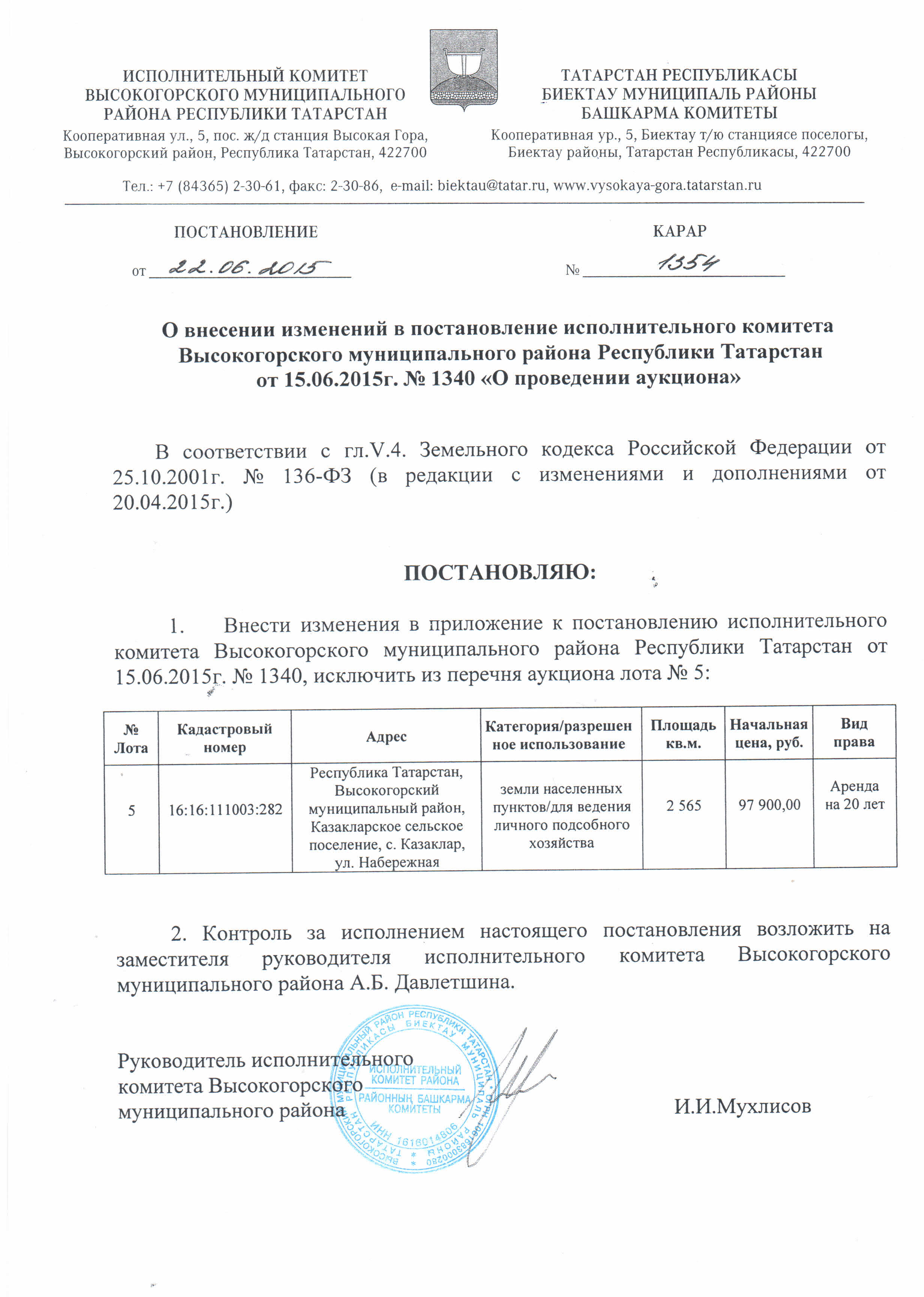 Постановление исполнительного комитета Высокогорского муниципального района Республики Татарстан от 22.06.2015 г. № 1354 "О внесении изменений в постановление исполнительного комитета Высокогорского муниципального района Республики Татарстан от 15.06.2015 г. № 1340 «О проведении аукциона»