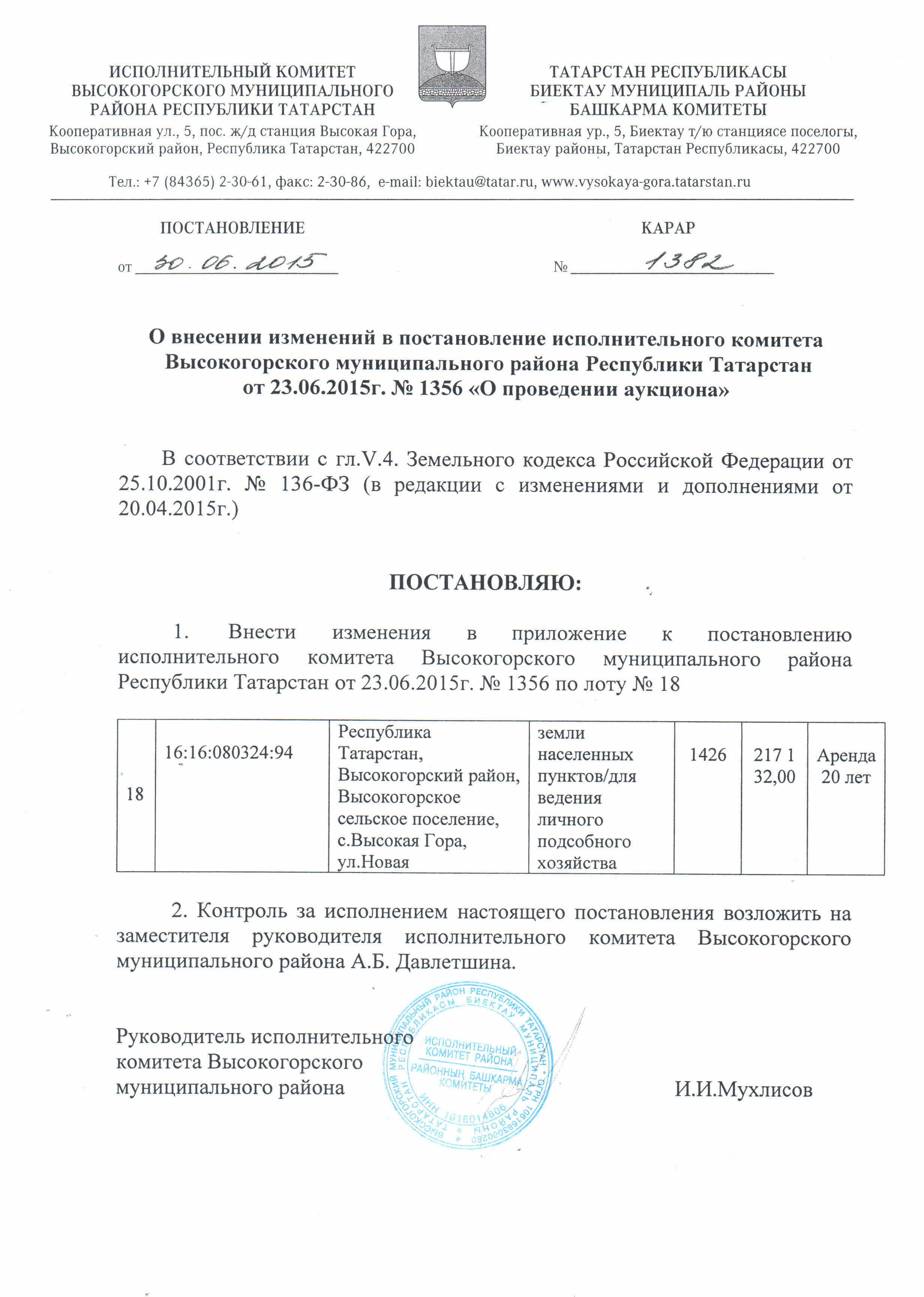 Постановление исполнительного комитета Высокогорского муниципального района Республики Татарстан от 30.06.2015 г. № 1382 "О внесении изменений в постановление исполнительного комитета Высокогорского муниципального района Республики Татарстан от 23.06.2015 г. № 1356 «О проведении аукциона»