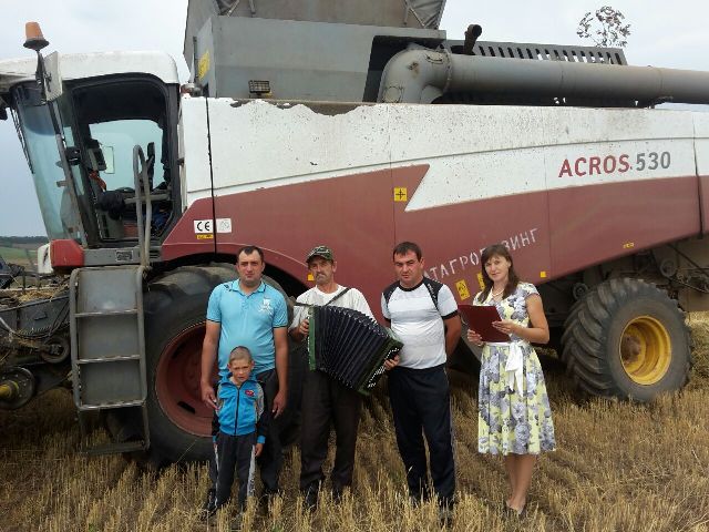 Суыксу мәдәният йорты һәм Кече Рәс клубы хезмәткәрләре агитбригада чыгышы белән комбайнерлар янында.